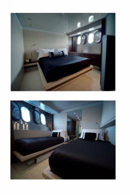 She can accommodates up to 12 guests in 6 luxury cabins, consisting of one Vip cabin on Main deck, one Master with one double bed, located forward on the lower deck and occupying full beam of the vessel, two Vip cabins ,located aft on the lower deck and two twin cabins located amidships and fitted with an additional pullman each, all cabins en-suite bathroom.