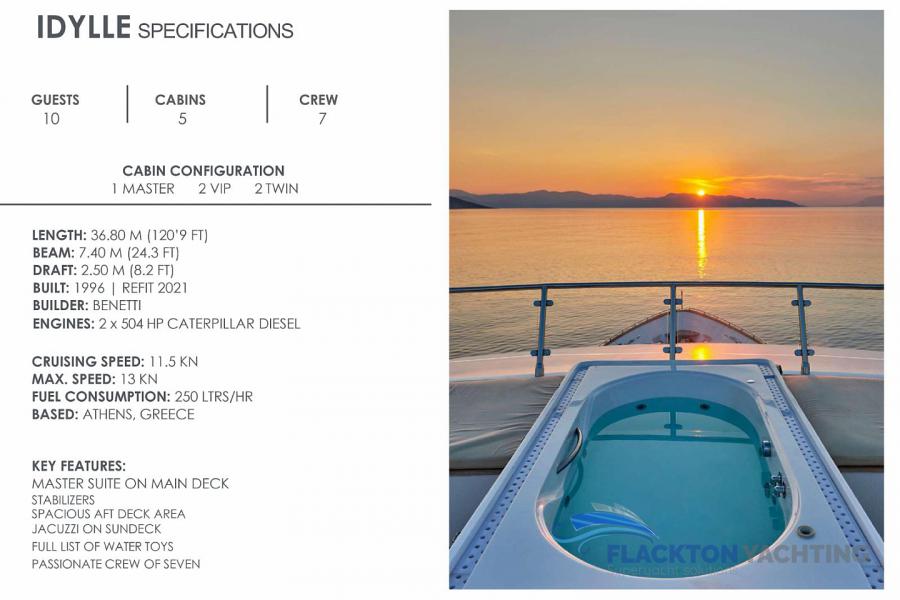 Delivered by Benetti yachts in 1996 and fully refitted in 2016 & 2020, IDYLLE is the perfect yacht for family charters, accommodating in ultimate luxury up to 10 guests in five elegant cabins.