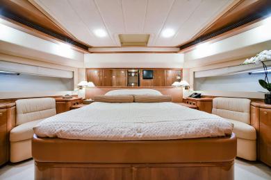 Delivered by Ferretti in 2006 and refitted in 2016 and 2019, DAY OFF has a beautiful layout of four cabins and she can accommodate up to ten guests. She presents a spacious sundeck area and a pool tub in the fly-bridge for unforgettable relaxing moments onboard. Her Zero Speed Stabilizers can ensure a comfortable cruise to the Greek islands under the service of her five crew members.